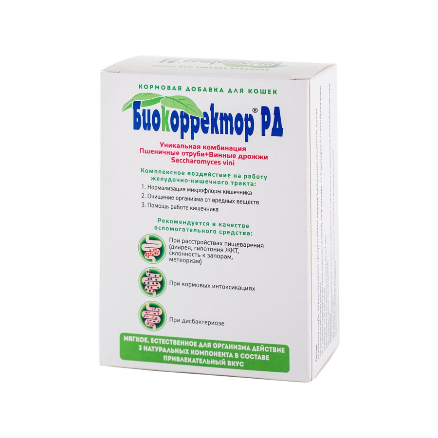 Биокорректор РД — уникальная биологически активная кормовая добавка для кошек, которая за счет сочетания сорбционных, пребиотических и моторикостимулирующих свойств комплексно решает проблемы, связанные с желудочно-кишечным трактом и кожей.