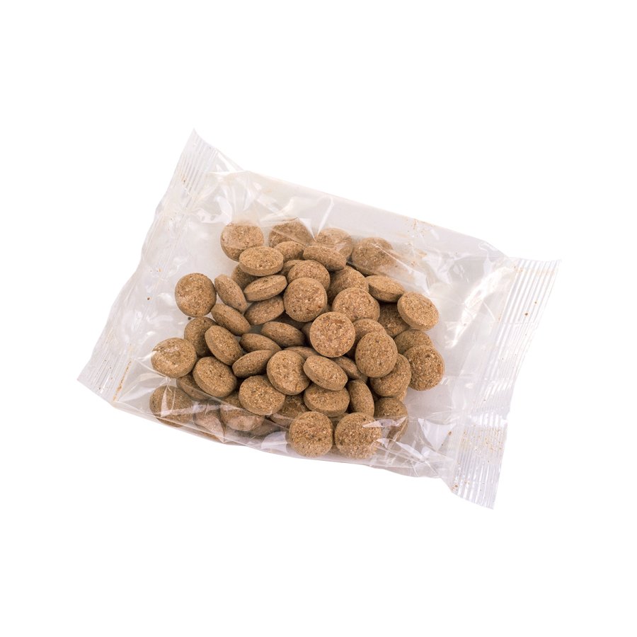 В одной таблетке содержится (на сухое вещество, не менее): протеина — 18%, клетчатки — 10%.