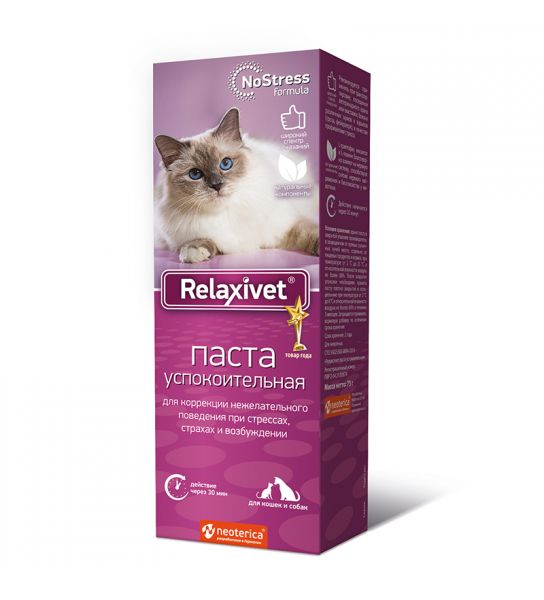 Кормовую добавку Релаксивет, пасту успокоительную, применяют для коррекции нежелательного поведения и повышения устойчивости нервной системы у кошек и собак к стрессу.