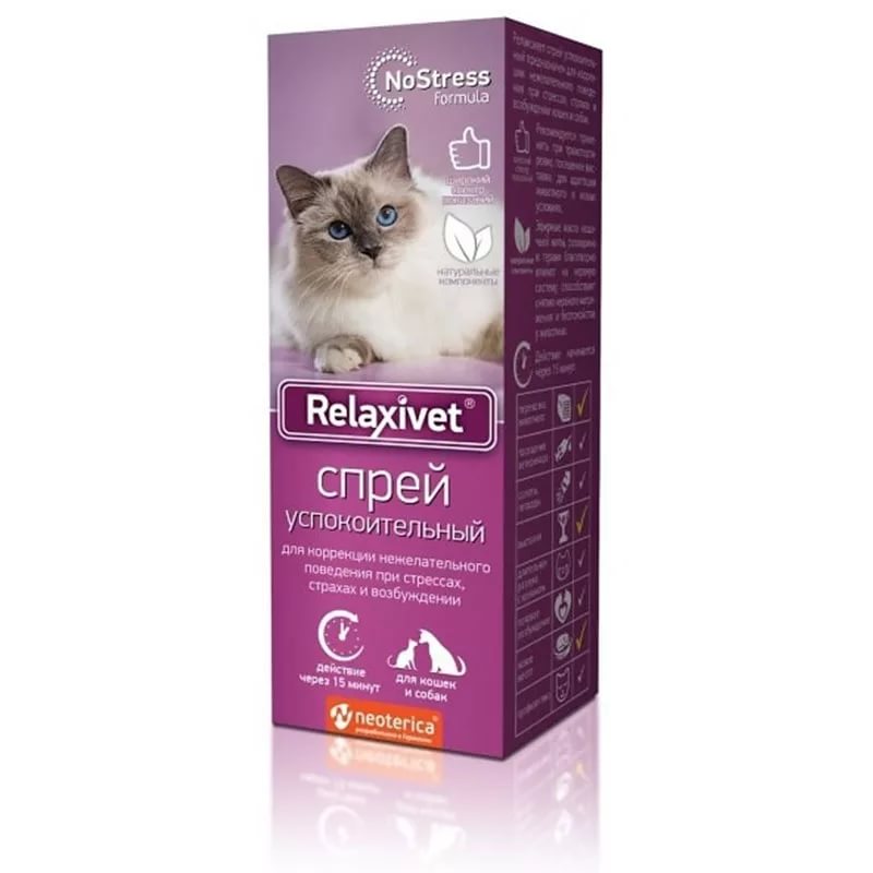 Релаксивет спрей успокоительный предназначен для коррекции нежелательного поведения при стрессах, страхах и возбуждении у кошек и собак.