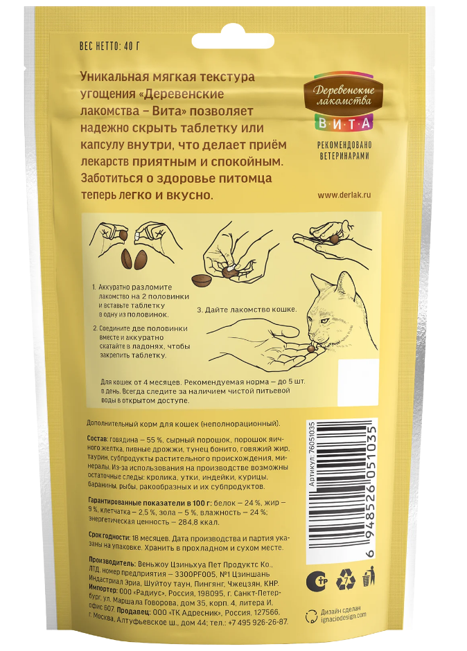 Функциональное угощение для кошек из отборной говядины для удобного приема таблеток. Уникальная мягкая текстура угощения «Деревенские лакомства — Вита» позволяет надежно скрыть таблетку или капсулу внутри. Его восхитительный вкус и аромат отвлекут вашего питомца, а удобная текстура позволит легко спрятать лекарство. Теперь забота о здоровье станет проще и приятнее!