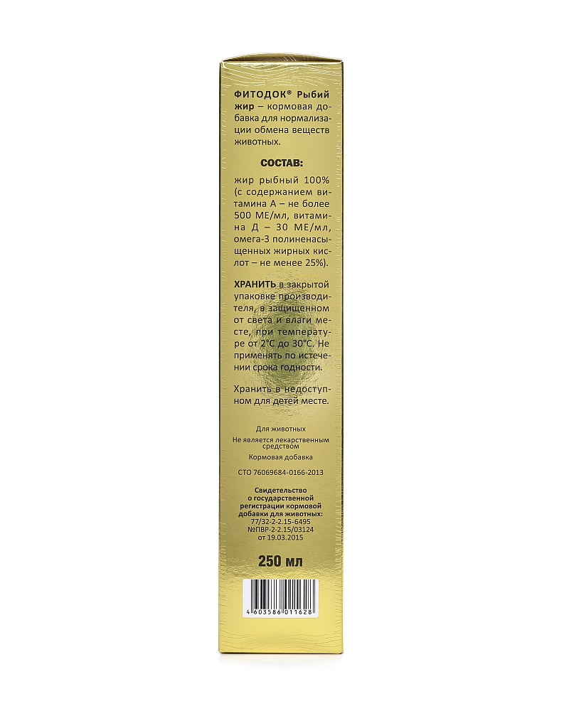 Состав: жир рыбный ветеринарный -100% (с содержанием витамина А – не более 500 МЕ/мл, витамина D –не менее 30 МЕ/мл, омега-3 полиненасыщенных жирных кислот – не менее 25%).