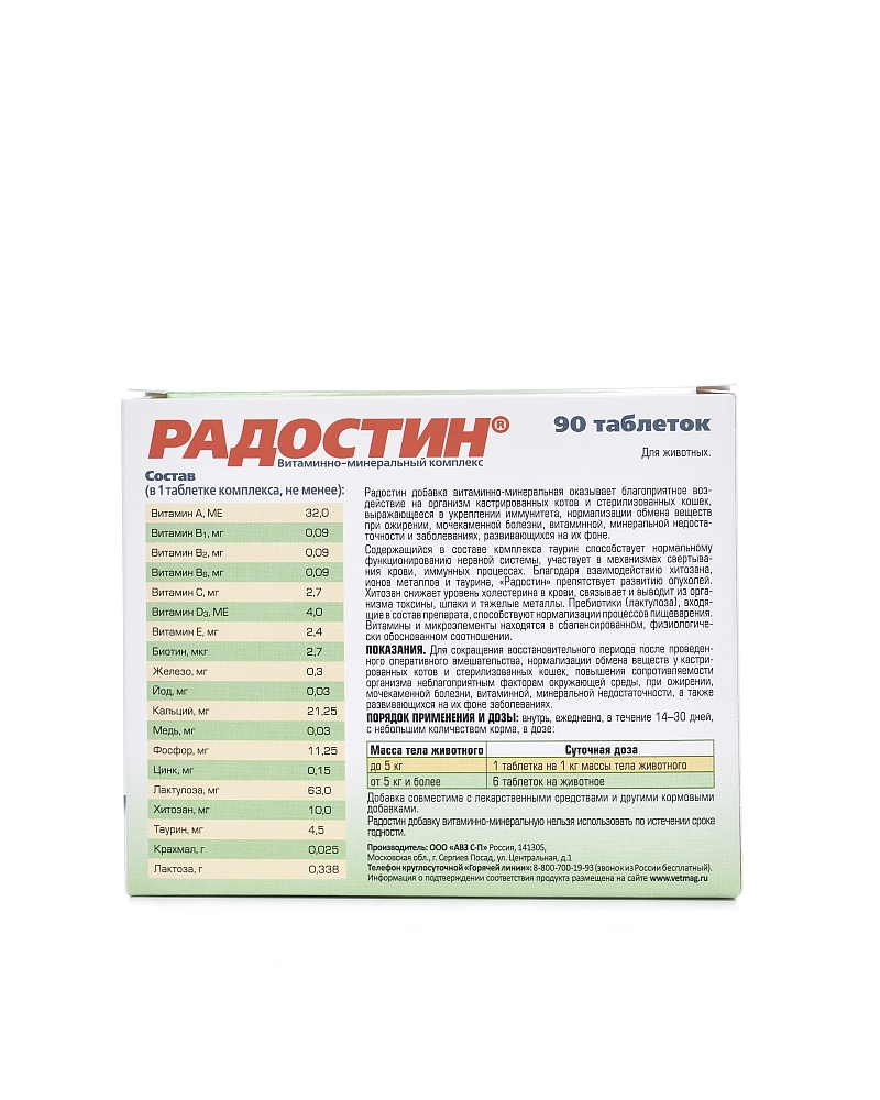 Витаминно-минеральный комплекс «Радостин» для собак и кошек – это комбинированный препарат, в котором витамины, макро- и микроэлементы находятся в сбалансированном, физиологически обоснованном соотношении, обеспечивая таким образом его максимальную эффективность.