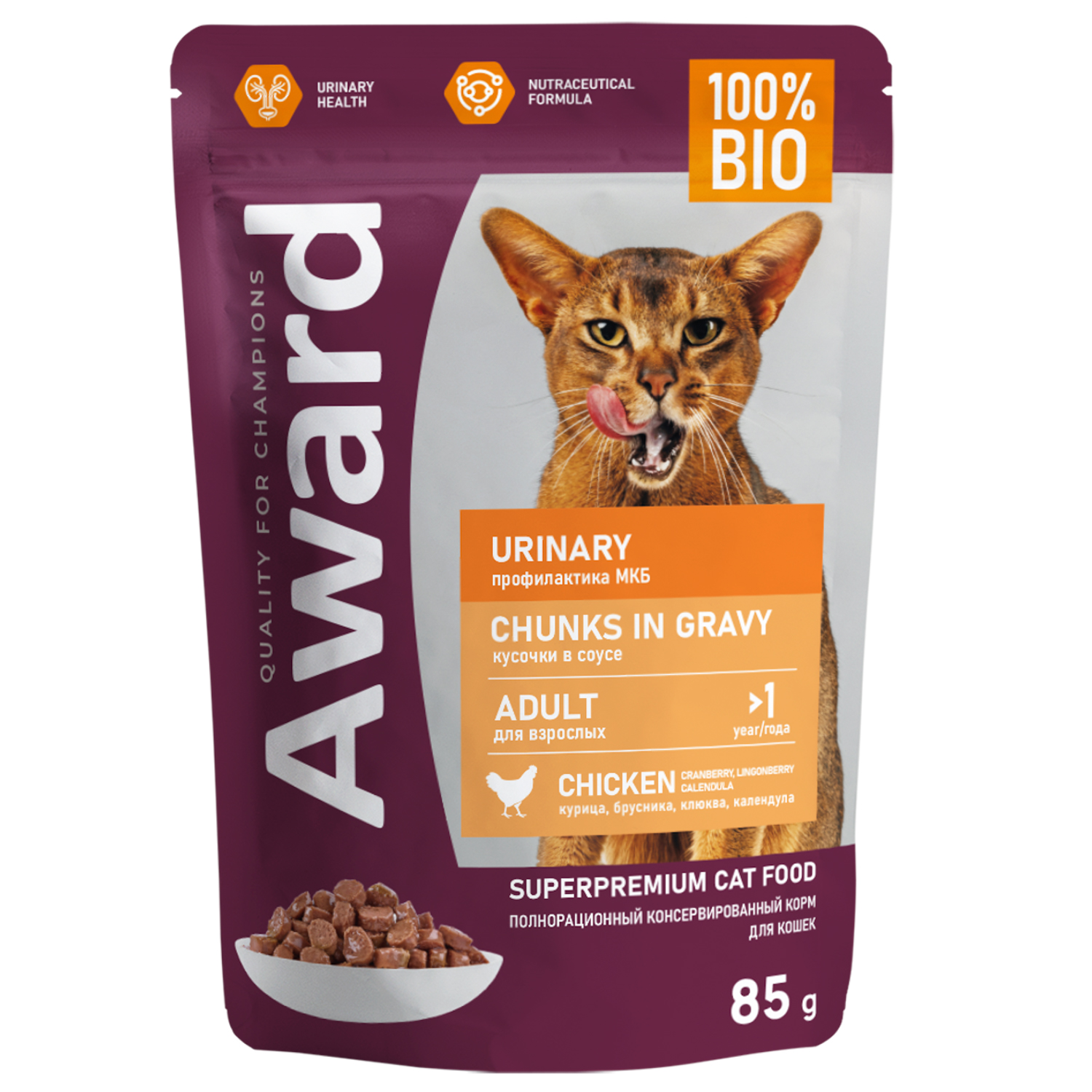 Award Cat пауч для кошек Urinary для профилактики мочекаменной болезни кусочки с Курице в соусе 85 г