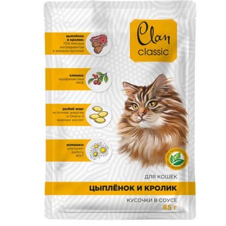 CLAN Classic пауч для кошек Цыпленок/кролик с клюквой и ромашкой в соусе 85 г