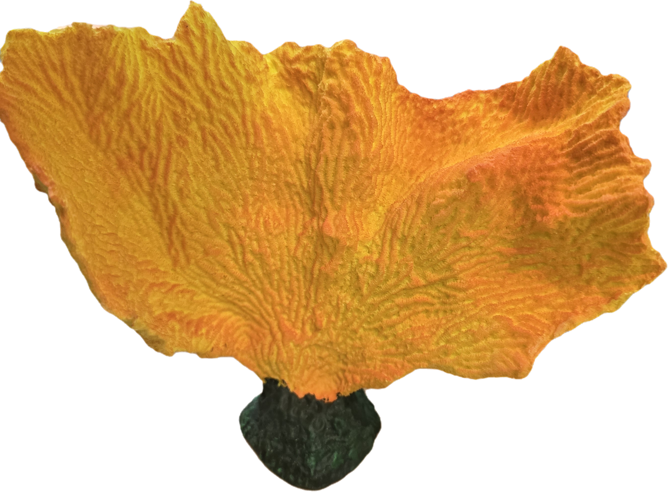 Аквариумная декорация в форме веерообразного коралла тёплого жёлто-оранжевого оттенка. Поверхность украшена тонким рельефным узором, напоминающим прожилки, что придаёт изделию реалистичный и «живой» вид. Устойчивая тёмная основа имитирует камень и позволяет надёжно разместить декорацию на дне аквариума.