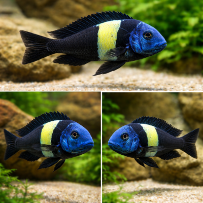 Взрослые особи имеют окраску головы от синей до серо-синей, окраска тела и плавников может варьироваться от синевато-серой до практически черной. Кроме того, взрослые цихлиды имеют яркую контрастную полосу посередине. Молодые особи просто очаровательны, окрашенные в черный цвет и в горошек белого цвета переходящего в синеватый оттенок.