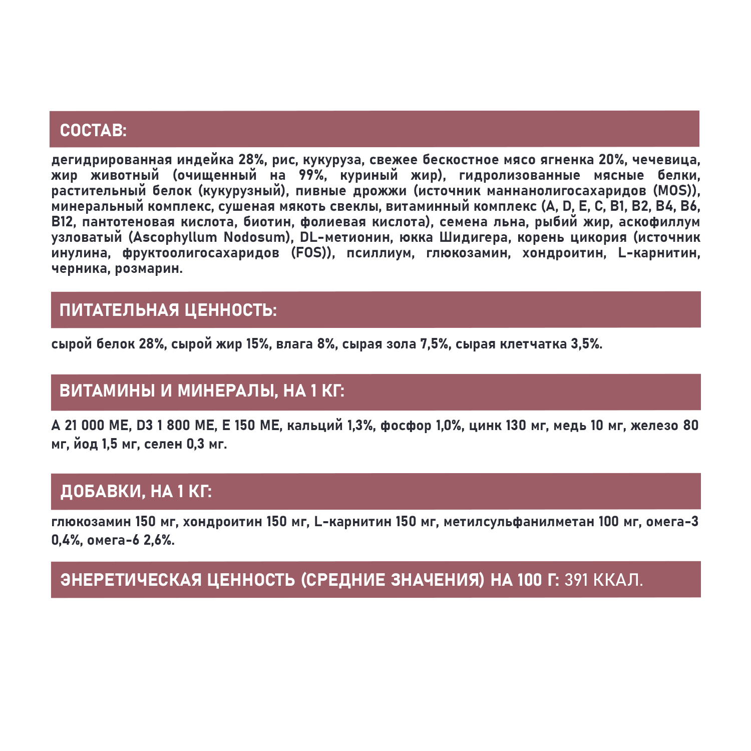 СОСТАВ: дегидрированная индейка 28%, рис, кукуруза, свежее бескостное мясо ягненка 20%, чечевица, жир животный (очищенный на 99%, куриный жир), гидролизованные мясные белки, растительный белок (кукурузный), пивные дрожжи (источник маннанолигосахаридов (MOS)), минеральный комплекс, сушеная мякоть свеклы, витаминный комплекс (A, D, E, C, B1, B2, B4, B6, B12, пантотеновая кислота, биотин, фолиевая кислота), семена льна, рыбий жир, аскофиллум узловатый (Ascophyllum Nodosum), DL-метионин, юкка Шидигера, корень цикория (источник инулина, фруктоолигосахаридов (FOS)), псиллиум, глюкозамин, хондроитин, L-карнитин, черника, розмарин.