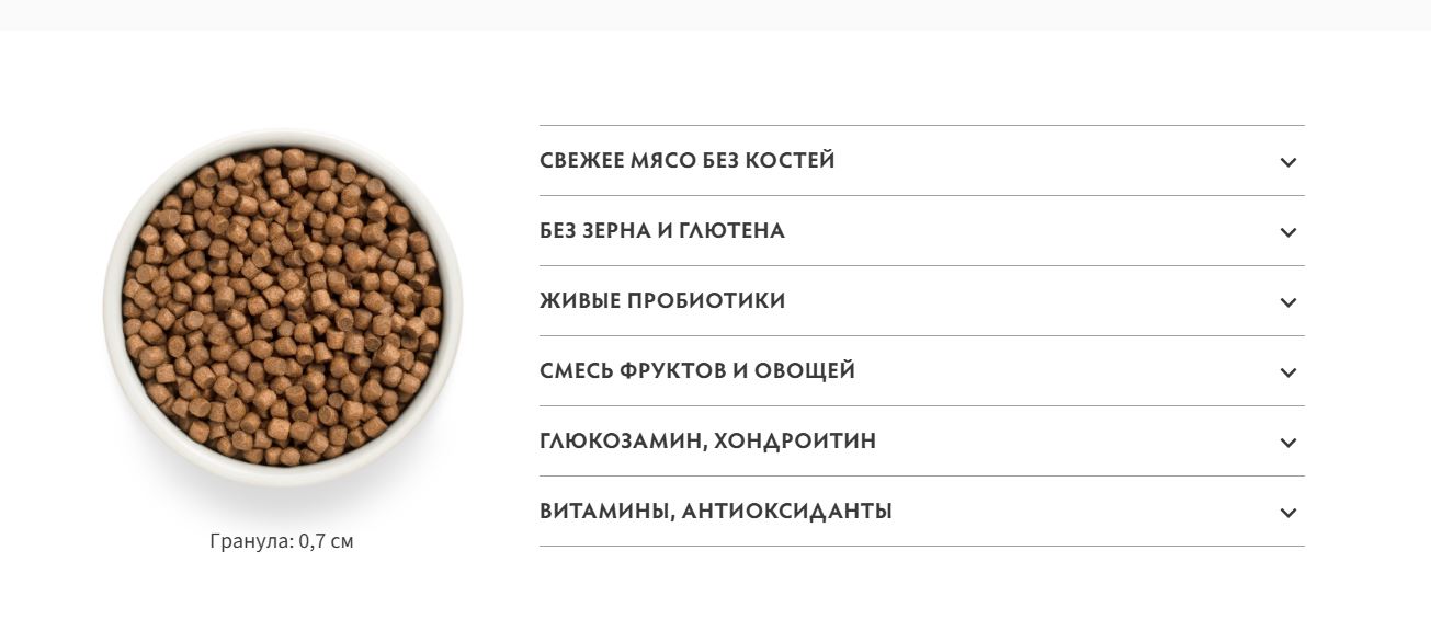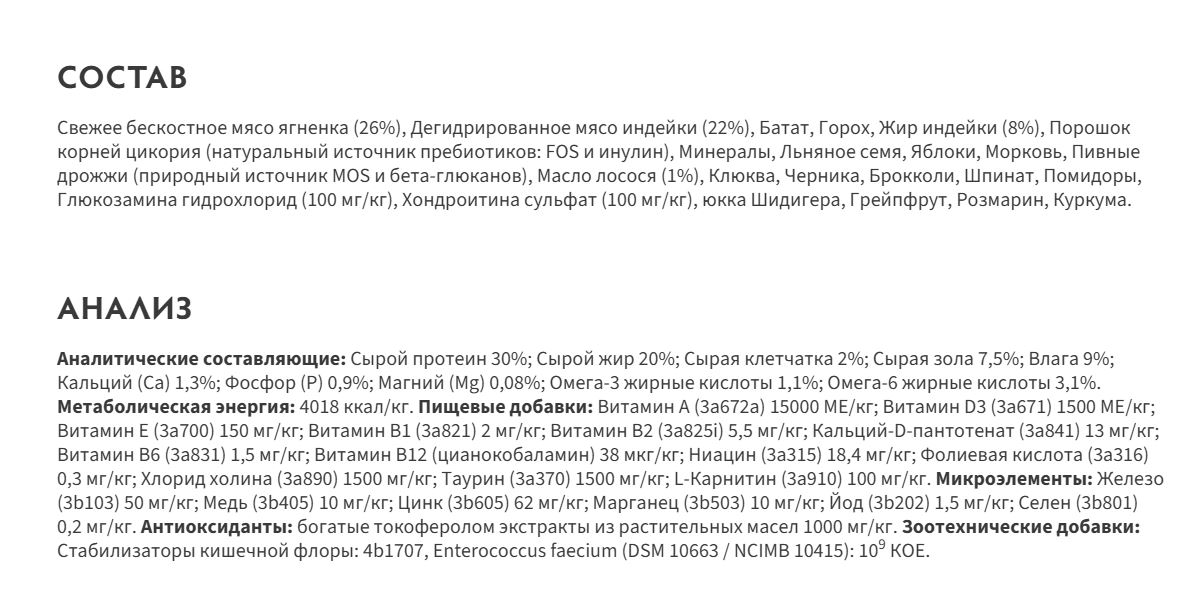 Состав: свежее бескостное мясо ягненка (26%), Дегидрированное мясо индейки (22%), Батат, Горох, Жир индейки (8%), Порошок корней цикория (натуральный источник пребиотиков: FOS и инулин), Минералы, Льняное семя, Яблоки, Морковь, Пивные дрожжи (природный источник MOS и бета-глюканов), Масло лосося (1%), Клюква, Черника, Брокколи, Шпинат, Помидоры, Глюкозамина гидрохлорид (100 мг/кг), Хондроитина сульфат (100 мг/кг), юкка Шидигера, Грейпфрут, Розмарин, Куркума.