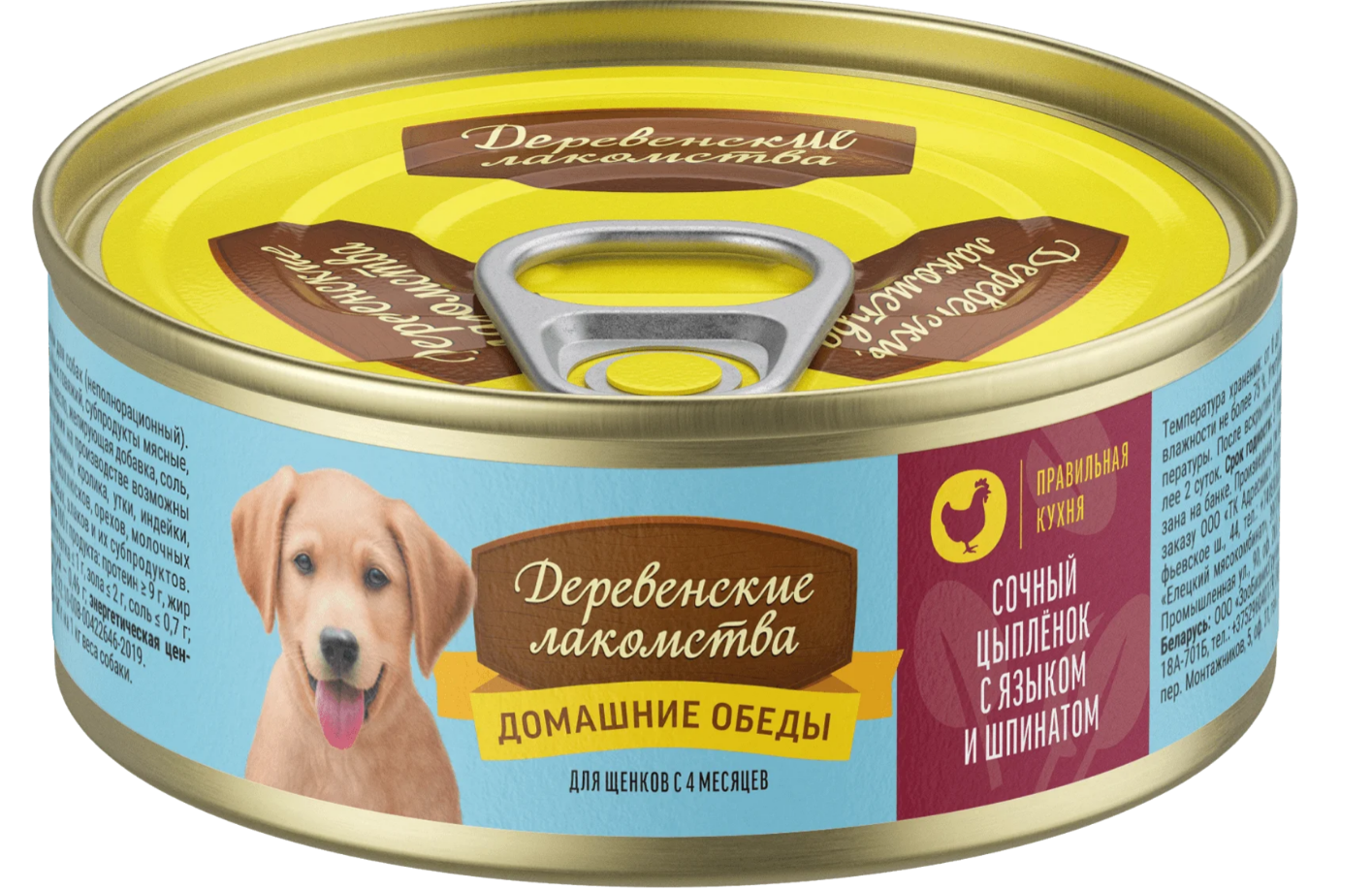 Деревенские лакомства консервы для щенков Цыпленок с языком 100 г