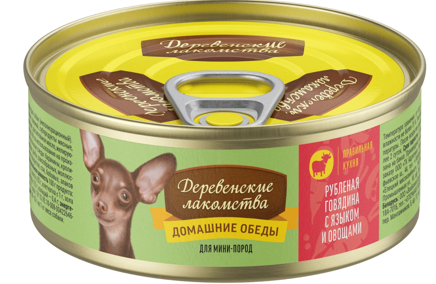 Деревенские лакомства консервы для собак Говядина рубленая с языком и овощами 100 г