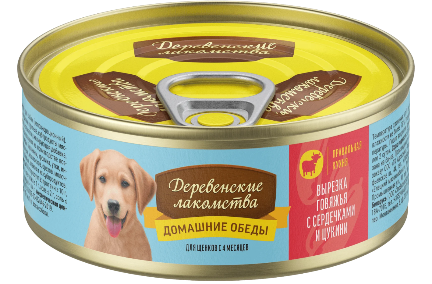 Деревенские лакомства консервы для щенков Говяжья вырезка с сердечками и цукини 100г