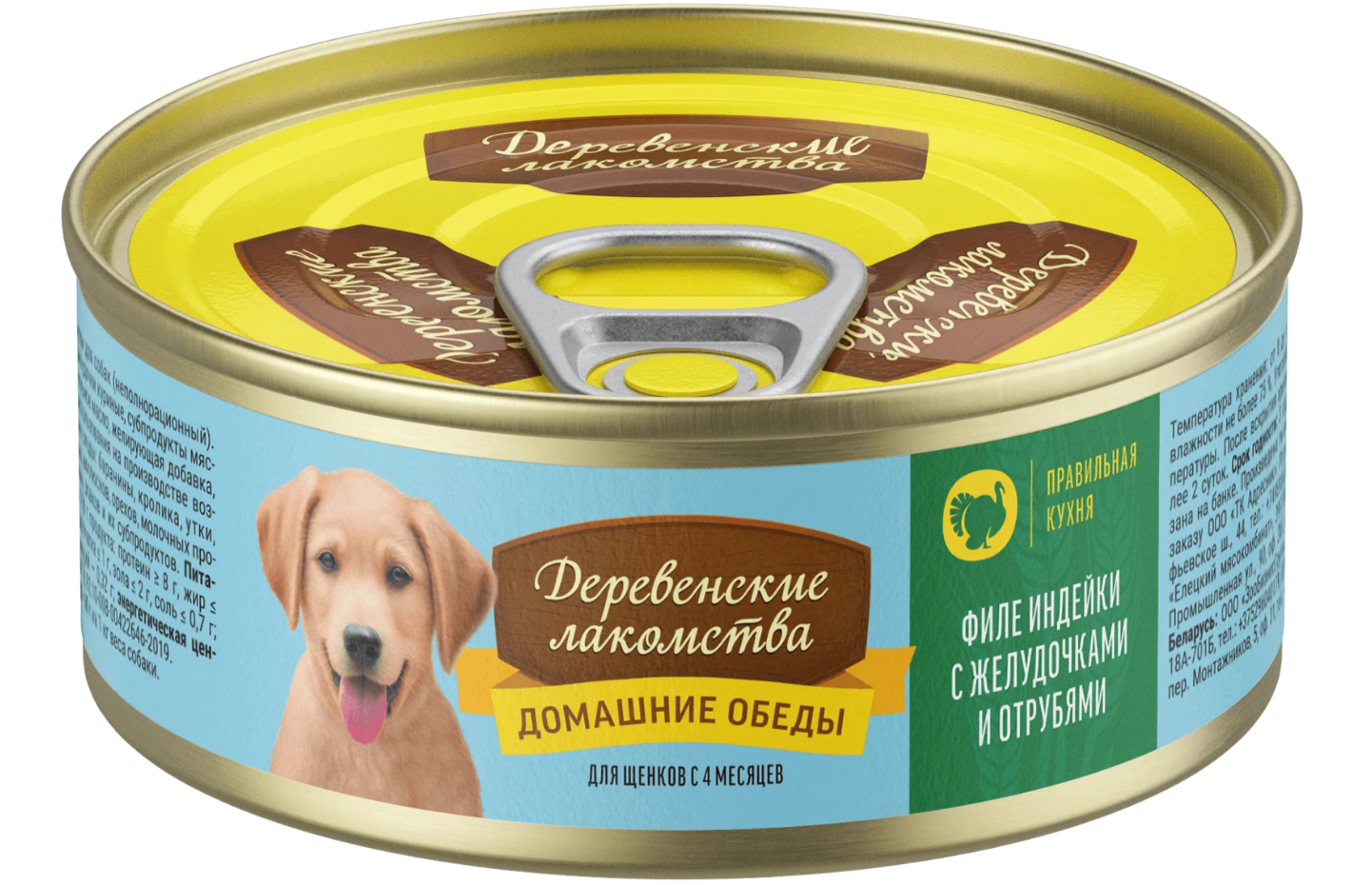 Деревенские лакомства консервы для щенков Индейка с желудками и отрубями 100г