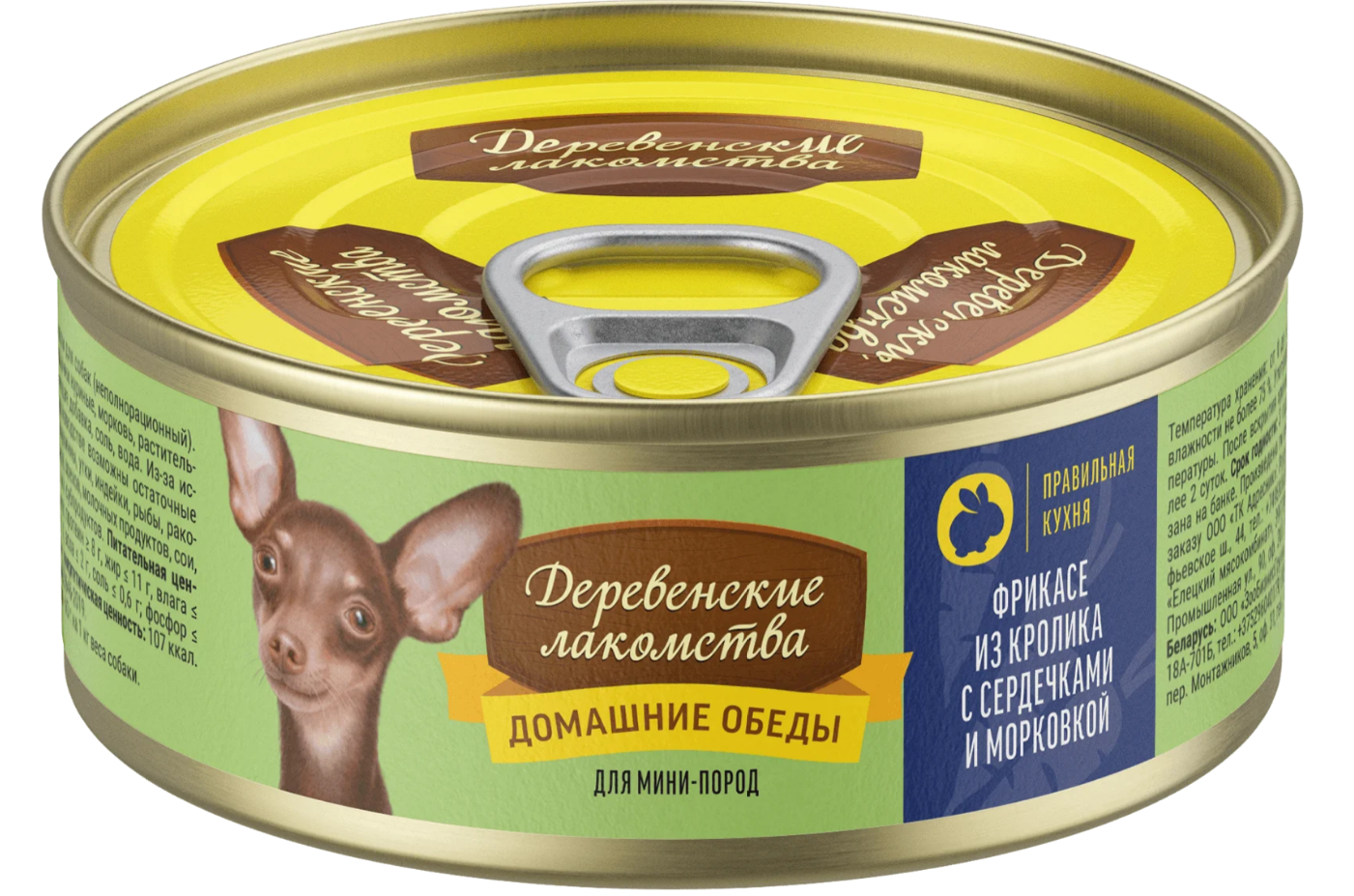 Деревенские лакомства консервы для собак Фрикасе из кролика сердечками и морковью 100 г