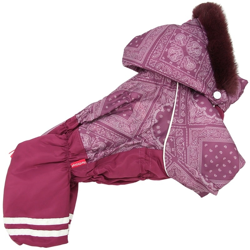 Зимний комбинезон для собак для сук, состоит из: - водоотталкивающей и ветрозащитной ткани (100% полиэстер), обработанной водоотталкивающей (PU) пропиткой (верхний слой), утепленной и простеганной подстежкой (внутренний слой).