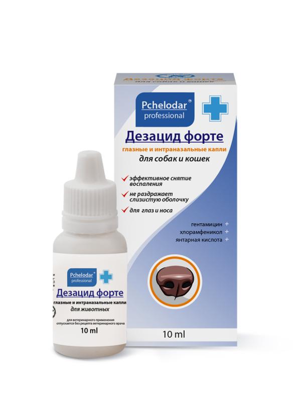 Дезацид Форте оказывает выраженное противобактериальное, противовоспалительное и регенерирующее действие на ткани глаза и носа животного.