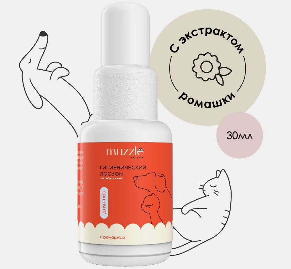 Лосьон для глаз Muzzle предназначен для бережного ухода и нежного очищения чувствительной области вокруг глаз животных. Активные компоненты быстро размягчают и удаляют корочки, струпья, экссудат (выделения) с кожи и шерсти вокруг глаз. Капли для наружной чистки глаз помогают избавить животное от дискомфорта и уменьшить окрашивание шерсти под глазами животного, избавляют от слезных дорожек. ОСОБЕННОСТИ СОСТАВА: Ромашка обладает успокаивающими свойствами, снимает отечность и раздражение век. СПОСОБ ПРИМЕНЕНИЯ: нагрейте флакон до температуры тела животного и тщательно встряхните. Смочите ватный тампон небольшим количеством препарата и обработайте область вокруг глаз, по направлению от наружного угла глаза к внутреннему, аккуратно устраняя выделения. Повторите обработку уже очищенного глаза чистым ватным тампоном в том же порядке. Средство подходит для профилактики конъюнктивита.оин, таурин, янтарная кислота, вспомогательные компоненты