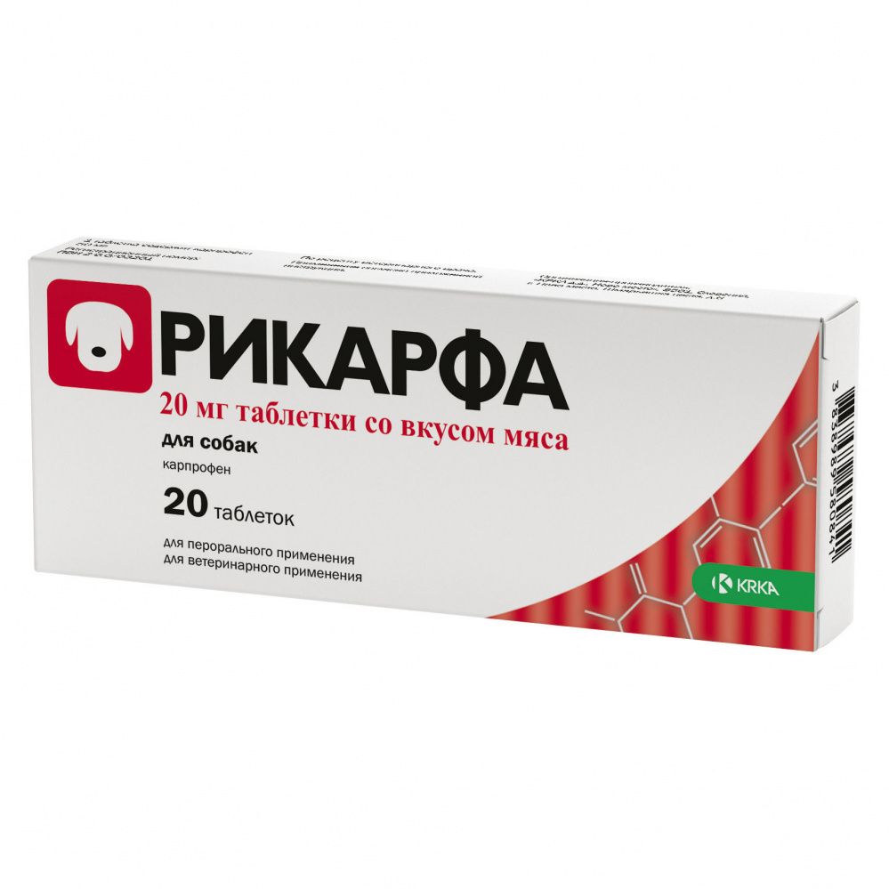 Карпрофен — наиболее изученное нестероидное противовоспалительное, обезболивающее и противоотечное средство последнего поколения для собак в лечении заболеваний опорно-двигательного аппарата. Карпрофен ингибирует фермент циклоксигеназу в цикле арахидоновой кислоты. При этом препарат преимущественно влияет на циклоксигеназу-II, которая вырабатывается в ответ на воспаление. В результате этого блокируется синтез простагландинов. В терапевтических дозах карпрофен значительно слабее действует на циклоксигеназу-I, и благодаря этому не оказывает существенного влияния на синтез протективных простагландинов, недостаток которых в организме способен вызывать нарушения функции почек (замедление почечного кровотока), агрегации тромбоцитов, повышение секреции желез желудка и кишечника, нарушение водно-солевого баланса, сердечной деятельности и другие функциональные расстройства. Препарат обладает антибрадикининовой активностью, подавляя восприятие боли на уровне центральных отделов головного и спинного мозга. Карпрофен быстро всасывается из желудочно-кишечного тракта, и его концентрация достигает пика в плазме крови через 1 – 3 часа после применения внутрь. Время полувыведения составляет около 10 часов. Карпрофен более чем на 99 % связывается с белками плазмы и метаболизируется в печени, выделяясь с фекалиями (около 80 %) и мочой. Рикарфа таблетки со вкусом мяса по степени воздействия на организм теплокровных животных относится к умеренно опасным веществам.